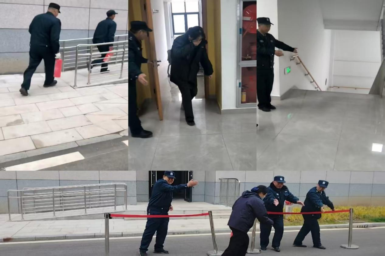 疏散逃生演练组织的紧张有序。随着火警声响起,安全疏散组迅速组织起火楼宇内人员疏散,逃生人员用湿毛巾捂住口鼻,低姿弯腰,按照演练预定路线快速有序撤离到安全区域;扑救灭火组迅速到达现场,完成初起火情扑救;现场警戒组设置警戒线,维持现场秩序;后勤保障组安排专人对接消防救援车并引导至起火点。