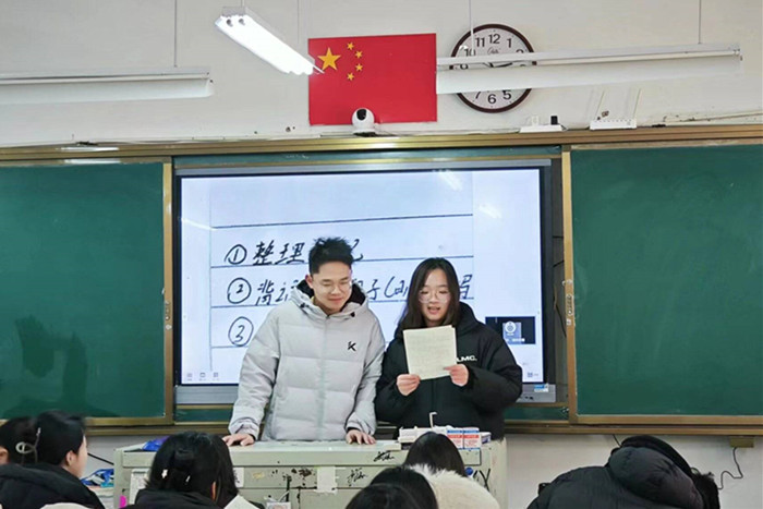 陈思雨细心整理了高中时期的学习心得,针对不同的学科,罗列出不同的学习方法呈现给学弟学妹们。她分享了大学的学习安排、社团活动和各类比赛。她鼓励同学们始终保持学习的心态,为实现自己的人生理想努力奋斗。黄齐从外出交通安全,居家用电安全,饮食安全,消防安全,网络安全,预防传染病安全等六个方面向学弟学妹们进行安全教育宣传,以幽默风趣的语言阐述各种生活中遇到的安全小故事,加深了同学们的安全意识。