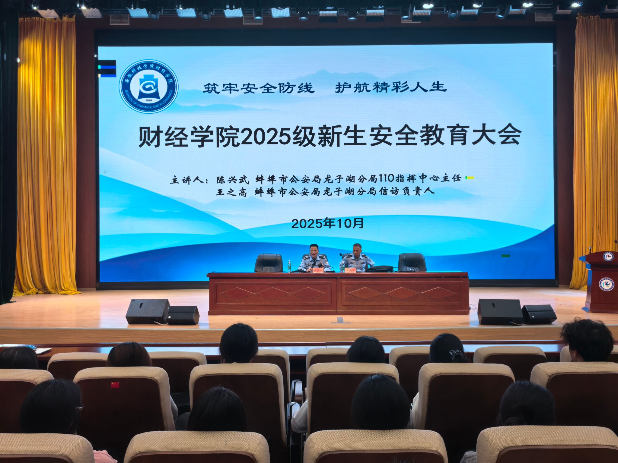 为增强2025级新生安全防范意识,筑牢新生校园安全防线,10月11日,财经学院在东辅楼二楼报告厅召开2025级新生安全教育大会。会议由学院党委副书记、纪委书记耿广汉主持,蚌埠市公安局龙子湖分局110指挥中心主任陈兴武、分局信访负责人王之高主讲,2025级辅导员及全体新生参会。