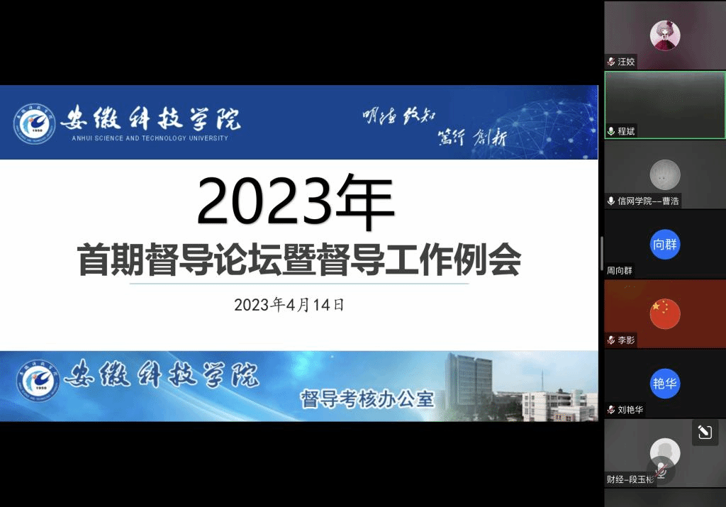为加强教学督导与教学质量监控工作、保障学校教学工作顺利进行,提升教育教学质量,4月14日下午,督导考核办公室利用腾讯会议平台,举行首期督导论坛暨教学督导线上工作会议,全体校督导员、院督导组成员及督导考核办公室工作人员参加了会议,会议由督导考核办公室主任程斌主持。