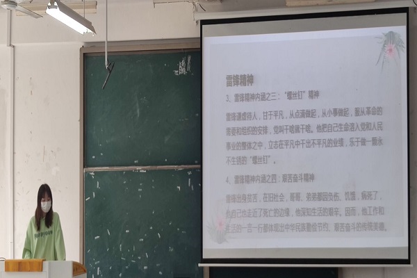褚晨晨细致地介绍了雷锋与雷锋精神,她指出雷锋精神内涵主要由“上”和“善”两部分组成,“上”是指在工作、学习、生活等方面追求“向上”;“善”则是指在理想信念、价值取向和人际关系等方面“向善”。褚晨晨呼吁全体成员将雷锋精神融入到学习与生活中,在生活中形成勤俭节约和吃苦耐劳的作风,发扬雷锋同志的奉献精神、爱国精神和合作精神。与会人员就自身对于雷锋精神中奉献精神、“钉子”精神、艰苦奋斗精神的认识发表看法。