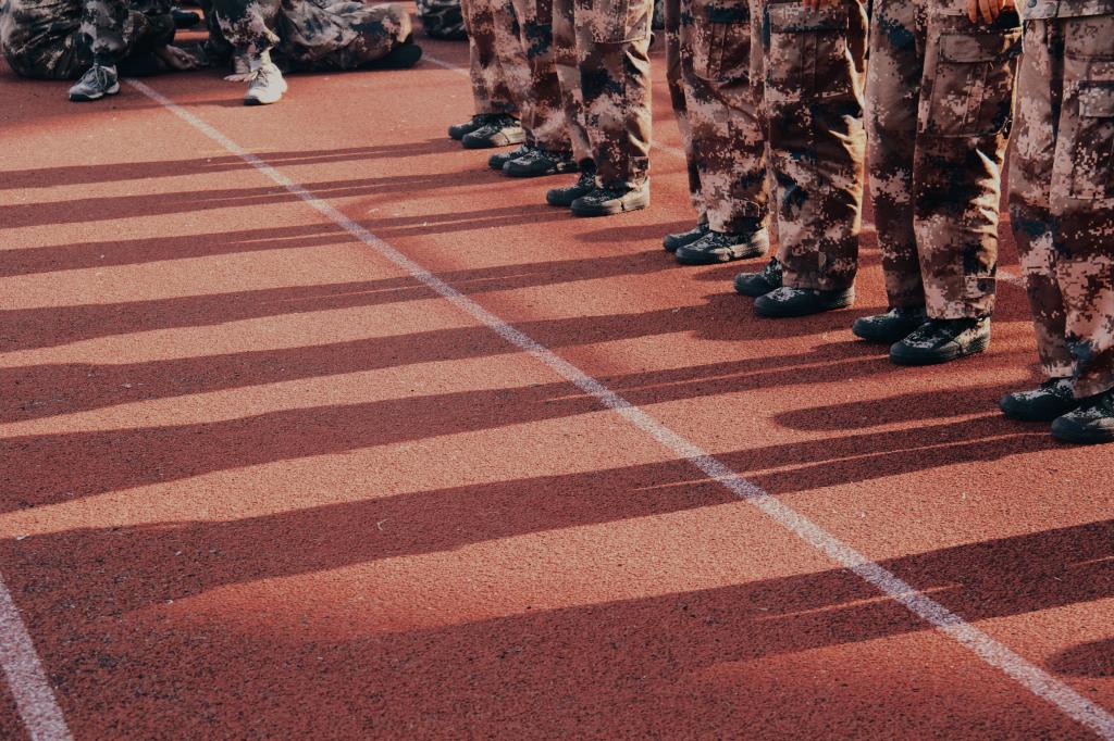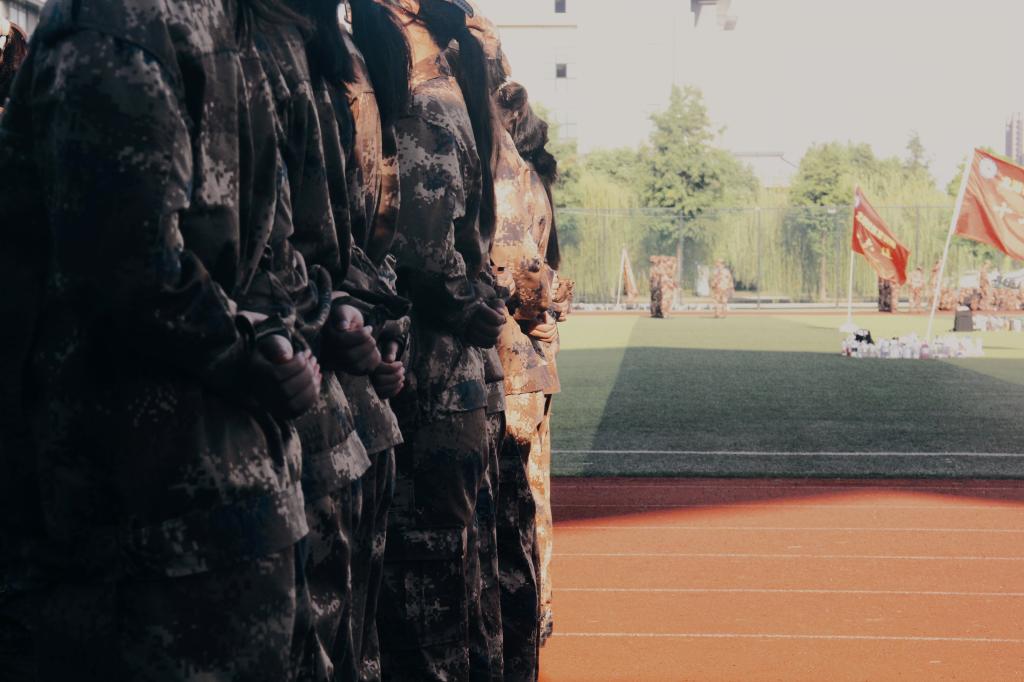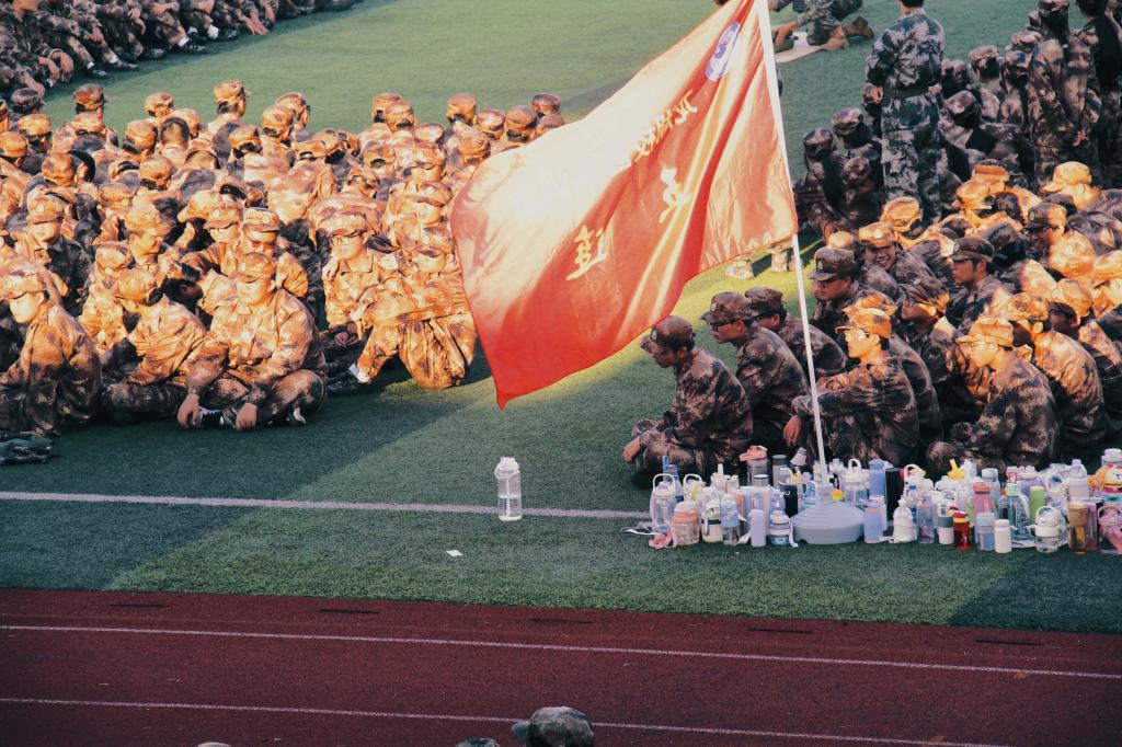 迎朝阳初升,送夕阳褪去。我们挺拔如松,每一个动作都一丝不苟。操场上,只见高扬旗帜,猎猎随风。休息时,耳畔军歌,气贯长虹。一夕迷彩衣,从此荣辱身。