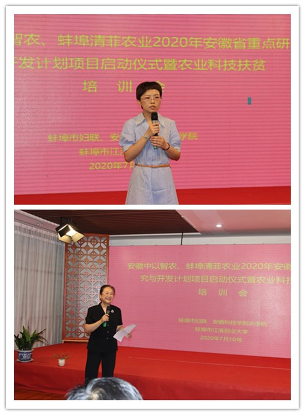 市妇联副主席蒋纹,WG官方网站农学院院长詹秋文,市科技局农村与社会发展科技科副科长李帆,蚌埠市江淮创业大学、安徽中以智农众创空间有限公司董事长方雯,蚌埠清菲农业科技有限公司董事长翟明安,怀远、固镇、五河三县15个扶贫村村干部及村民代表出席会议。