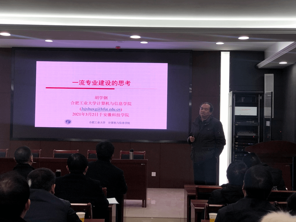 为深入推进一流专业与一流课程建设,3月2日下午,学校邀请合肥工业大学胡学钢教授和王浩教授到校作“一流专业建设、一流课程建设、工程教育专业认证”专题报告,校教学督导组、各学院分管教学副院长、信息与网络工程学院全体教职工共同在龙湖校区西附楼111聆听了报告,报告由校党委委员、副校长黄友锐主持。