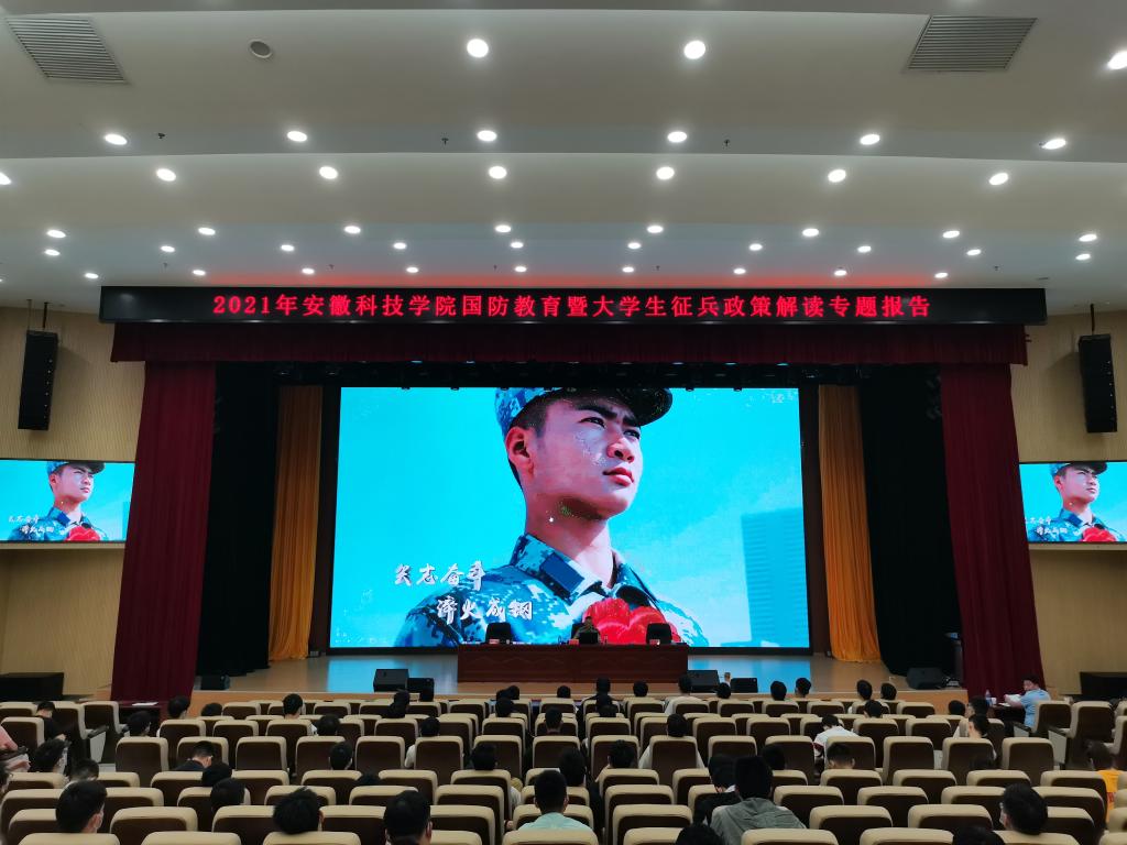 国无防不立,民无兵不安。为进一步加强国防教育,增进广大师生爱国热情,根据本年度国防教育暨征兵工作安排,5月26日下午,学校在龙湖校区东辅楼报告厅举办了2021年国防教育暨大学生征兵政策解读专题报告会。蚌山区人民武装部政委刘跃、部长曾鸣受邀为师生作报告。校人武部负责人、龙湖校区各学院征兵联络人、毕业班学生和全体辅导员以及有意向参军的同学参加了此次报告会。会议由校人武部副部长邵传雷主持。