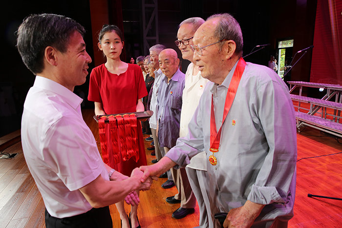 比赛期间隆重举行了WG官方网站“光荣在党50年”纪念章颁发仪式。党委书记蒋德勤为丁为群、代梅英、仲正林、李庆山、李思义、吴明友、张怀金、张学礼、张景法、陈玉胜、崔贤仪、潘成德等12名在校的老党员代表颁发纪念奖章。为“光荣在党50年”的老同志颁发纪念奖章,是中国共产党成立100周年庆祝活动的重要组成部分。纪念章的颁发,见证着老党员的无悔初心。莫道桑榆晚,为霞尚满天。老党员是党执政兴国的重要资源,是推进中国特色社会主义伟大事业的重要力量。组织上入党一生一次,思想上入党却是一生一世,他们用自己的行动证明了自己的无悔初心。纪念章的背后,是无上的荣光,学校的全体师生也不会忘记他们为学校事业发展所做出的突出贡献。