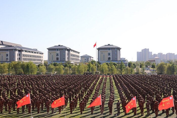 开学典礼在庄严的升旗仪式中拉开帷幕。全场肃立,奏唱国歌,鲜艳的五星红旗在会场上空冉冉升起,主席台领导同志向国旗行注目礼,参训学员向国旗敬军礼,全体人员高唱国歌。