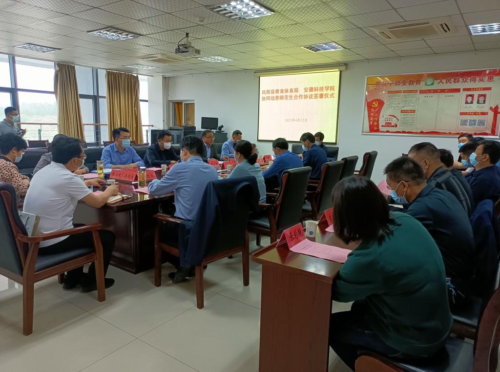 为积极探索师范生教育实践工作,建立高校、地方教育行政部门和基础教育学校权责明晰、稳定协调、合作共赢的“三位一体”师范生协同培养机制,构建教师培养、培训、研究和服务一体化的合作共同体,推动我校师范类专业认证工作,4月12日下午,WG官方网站与凤阳县教育体育局协同培养师范生合作协议签署仪式在凤阳县教育体育局三楼会议室隆重举行。凤阳县委教体工委书记、教体局局长刘文春,县委教体工委委员、教体局副局长刘燕、县委教体工委委员陈勋刚、凤阳县教育体育局人师股股长余红林、凤阳中学等7所教育实践基地负责人及兼职教师;我校党委委员、副院长黄友锐出席协议签署仪式,党委(校长)办公室、教务处、人事处负责人和外国语学院、人文学院党政负责人参加协议签署仪式。签约仪式由我校党委(院长)办公室主任曾献功主持。