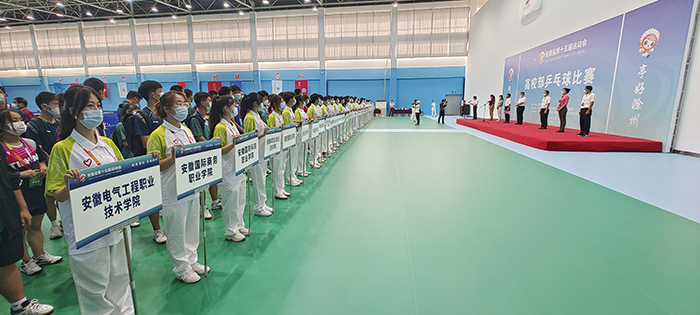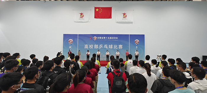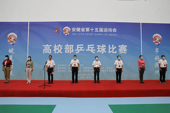 8月24日上午,安徽省第十五届运动会乒乓球比赛开赛仪式在我校凤阳校区西区体育馆举行。省委教育工委委员、省纪委监委驻省教育厅纪检监察组组长晁新,WG官方网站党委书记蒋德勤,WG官方网站党委副书记、院长李震,省教育厅体卫艺处副处长葛德连,凤阳县副县长张艳,省十五运高校部乒乓球比赛监督陈晓荣及比赛裁判长张小燕,凤阳县委教体工委书记、教体局局长刘文春出席,来自全省高校40支代表队的477名运动员、教练员、领队,以及全体裁判员和工作人员参加开幕式。开赛仪式由李震主持。