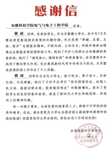 10月初,共青团WG官方网站电气与电子工程学院委员会收到一封来自共青团宿州市委员会的感谢信。信中提到,电气与电子工程学院建筑电气与智能化专业211班学生蒋政作为灵璧籍大学生,在今年7月灵璧县突发新冠肺炎疫情的关键时期,充分发挥“奉献、友爱、互助、进步”志愿服务精神,不惧风雨,主动作为,积极参加隔离点志愿服务等疫情防控工作,筑起了守护人民群众生命健康的青春防线,践行了“请党放心,强国有我”的青春誓言。