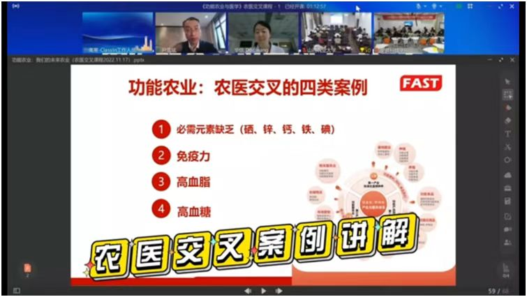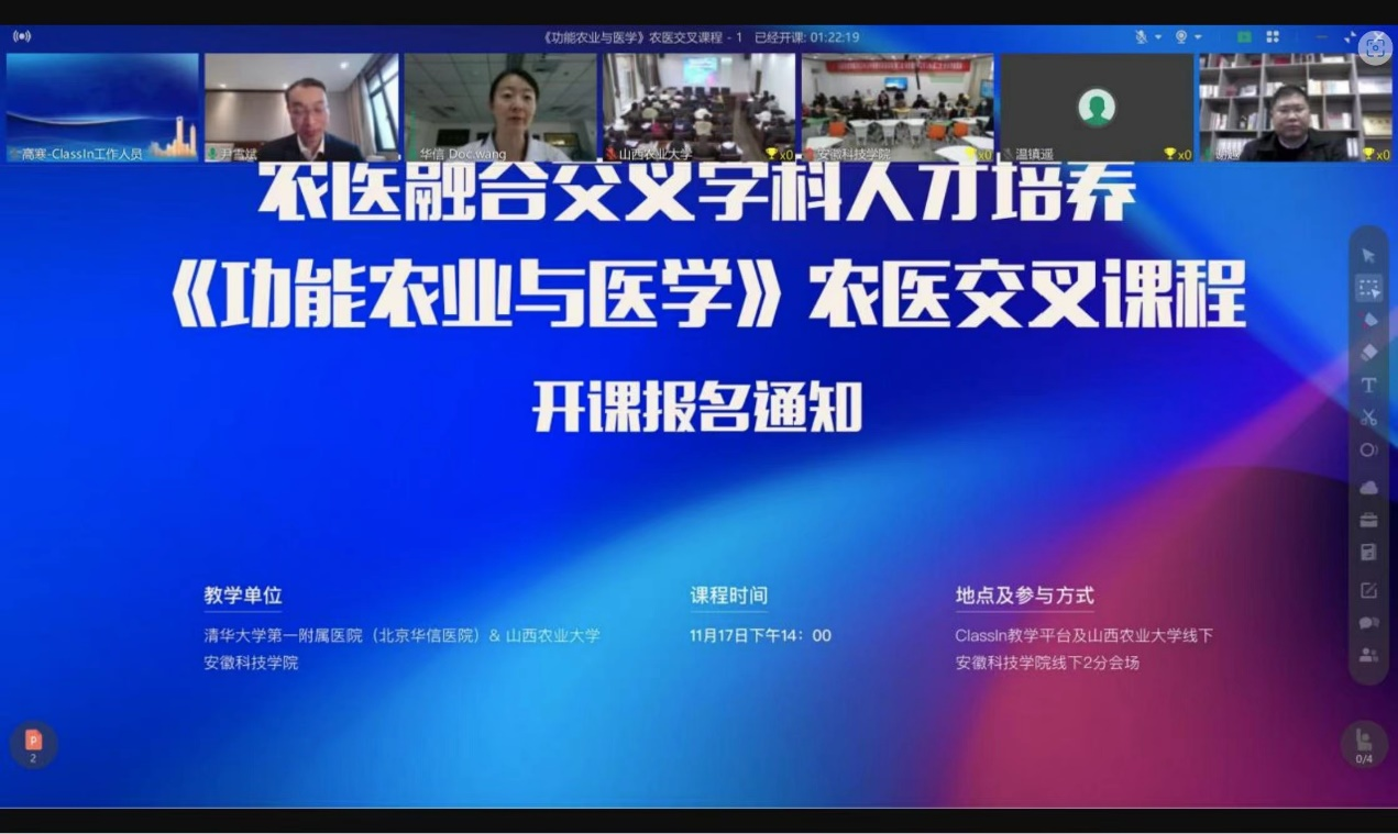 近日,我校与清华大学第一附属医院、山西农业大学合作举办了农医融合交叉学科人才培养课程首次授课。该课程由清华大学第一附属医院心血管内科副主任医师王晶、WG官方网站长三角功能农业(食品)研究院院长尹雪斌教授联合讲授。这也是《功能农业与医学》农医融合交叉第一课。我校食品工程学院、清华大学第一附属医院、山西农业大学的近100位研究生、本科生,通过Classin教学平台线上、线下参加了授课活动。