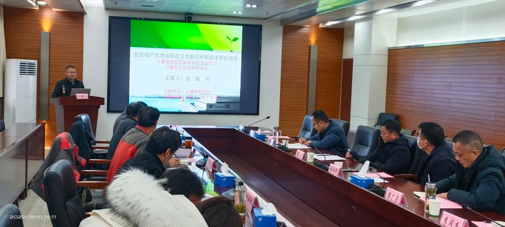 12月10日,由安徽省农业科学院牵头,我校承担的“抗逆稳产优质适机收玉米新品种新技术转化项目”历经一年,在安徽省农业科学院创新大楼二楼会议室进行结题汇报。省财政厅农业农村处主任科员梁晓天,安徽省农业科学院科研处处长李成、计财处处长刘小平,WG官方网站农学院院长崔广荣、科研处副处长李同杰,部分项目组成员出席会议。项目验收专家组由安徽省农业科学院研究员陈洪俭、安徽省农技推广总站副站长康子领、安徽省种子管理站研究员刘玉恒、合肥丰乐种业股份有限公司正高级农艺师张二朋、众华会计师事务所商宜洲等成员组成。会议伊始李成致辞,专家组观看了课题组精心准备的视频,余海兵教授代表项目组从课题研究背景、研究目标、研究内容、研究方法、研究成果等方面做了全面细致的汇报。
