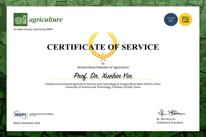 12月下旬,我校长三角功能农业(食品)研究院院长尹雪斌教授受邀担任国际农学知名刊物《Agriculture》编委,以促进功能农业新兴方向的科技成果交流。这是我校聚焦农业前沿交叉创新领域,战略引进功能农业领军人才,聚力加快打造“新农科”,扩大优势学科国际影响力方面的最新进展。