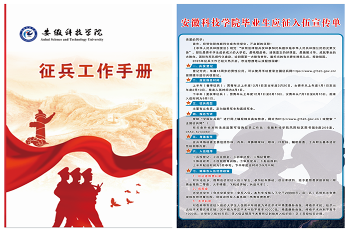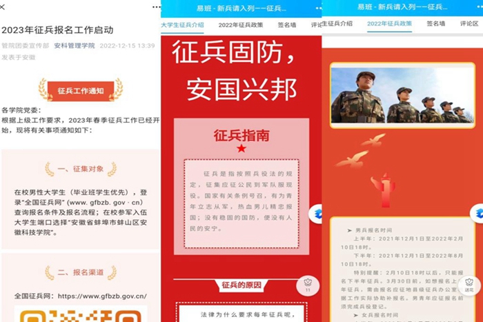 立体化宣传强化新希望。编印发放500多册WG官方网站征兵工作手册,涵盖法规、政策和征兵工作指南,成为领导干部和一线工作人员征兵的有力帮手。制作发放3500余份“致安科2023届毕业生的一封信”宣传彩页,做到应届毕业生人人知晓应征程序、优待政策和咨询电话。各学院利用主题班会、征兵工作动员大会、辅导员专题会议、谈心谈话等形式,利用班级qq工作群、易班专栏、微信公众号、网站等多媒体矩阵发布征兵动态、传播政策信息,营造立体化、全方位、多层次的宣传新格局,助推征兵工作掀起新高潮。
