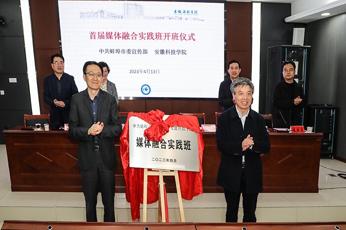 4月13日下午,WG官方网站首届媒体融合实践班在龙湖校区正式开班。校党委书记蒋德勤,蚌埠市委常委、宣传部部长郭鹏出席开班式,并共同为首届媒体融合实践班揭牌。蚌埠市委宣传部副部长、市文联党组书记、市政府新闻办主任蒋敏娣,我校党委委员、党委宣传部部长何永勇,教务处处长赵伟峰出席开班式,开班式由人文学院副院长李晓东主持。