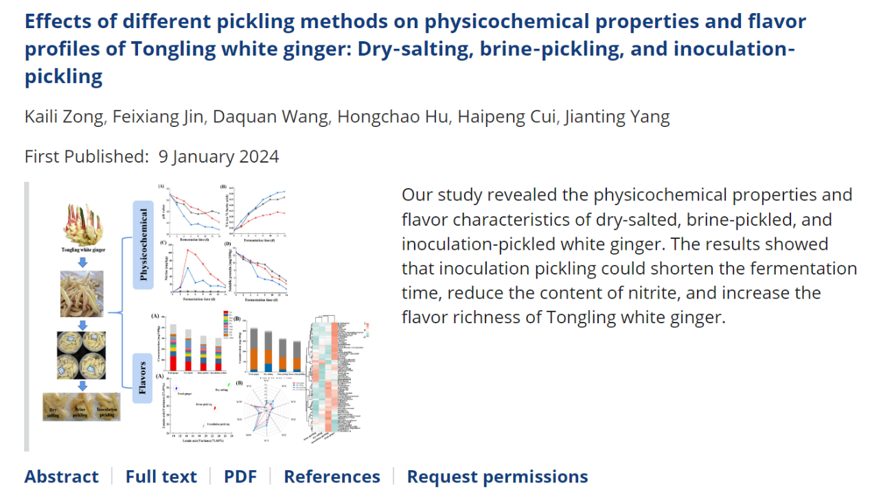 1月9日,我校果蔬精深加工与营养控制创新团队在农林科学领域二区期刊Food Science & Nutrition(IF=3.90)在线发表题为“Effects of different pickling methods on physicochemical properties and flavor profiles of Tongling white ginger: Dry‐salting, brine‐pickling, and inoculation‐pickling”的研究论文。我校食品工程学院2021级食品加工与安全领域研究生纵凯莉为第一作者,杨剑婷副教授为通讯作者,WG官方网站为唯一完成单位。