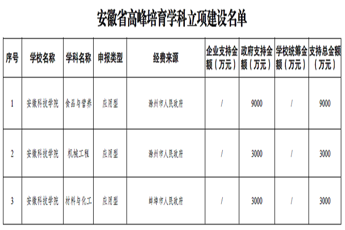 2023年2月,《安徽省教育厅关于立项建设高峰培育学科的通知》公布。我校3个学科进入安徽省高峰培育学科建设名单,学科建设获得新突破。其中,食品与营养作为Ⅱ类高峰培育学科进行建设,机械工程和材料与化工作为Ⅲ类高峰培育学科进行建设。获批高峰培育学科立项建设,是我校学科发展史上的重要里程碑。