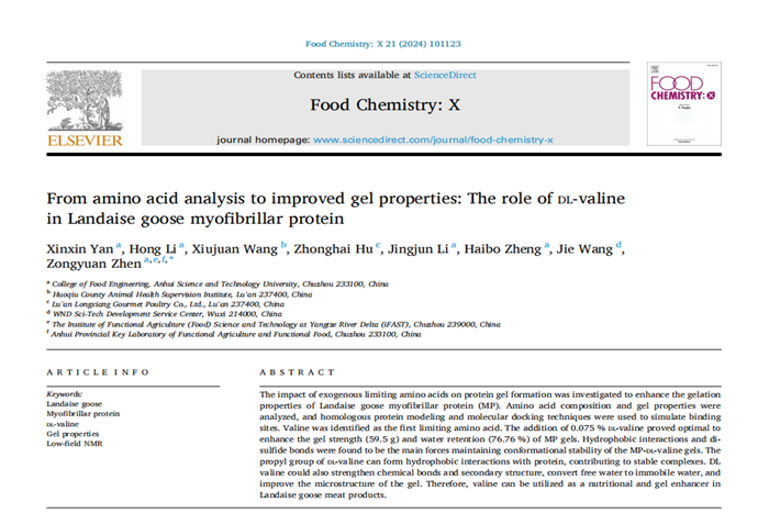 近期,我校食品工程学院动物源食品精深加工与营养团队在中国科学院农林科学领域一区TOP期刊Food Chemistry: X(IF=6.10)在线发表题为“From amino acid analysis to improved gel properties: The role of DL-valine in Landaise goose myofibrillar protein”的研究论文。食品工程学院2021级食品加工与安全领域硕士研究生燕鑫鑫为第一作者,甄宗圆副教授为通讯作者,WG官方网站为第一完成单位。