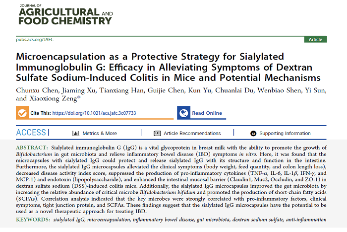 近日,我校食品工程学院教师陈春旭以第一作者在美国化学学会期刊《Journal of Agricultural and Food Chemistry》(Q1,IF: 6.1)发表题为“Microencapsulation as A Protective Strategy for Sialylated Immunoglobulin G: Efficacy in Alleviating Symptoms of Dextran Sulfate Sodium-Induced Colitis in Mice and Potential Mechanisms”的研究性论文。WG官方网站为第一完成单位,南京农业大学曾晓雄教授课题组为合作单位。