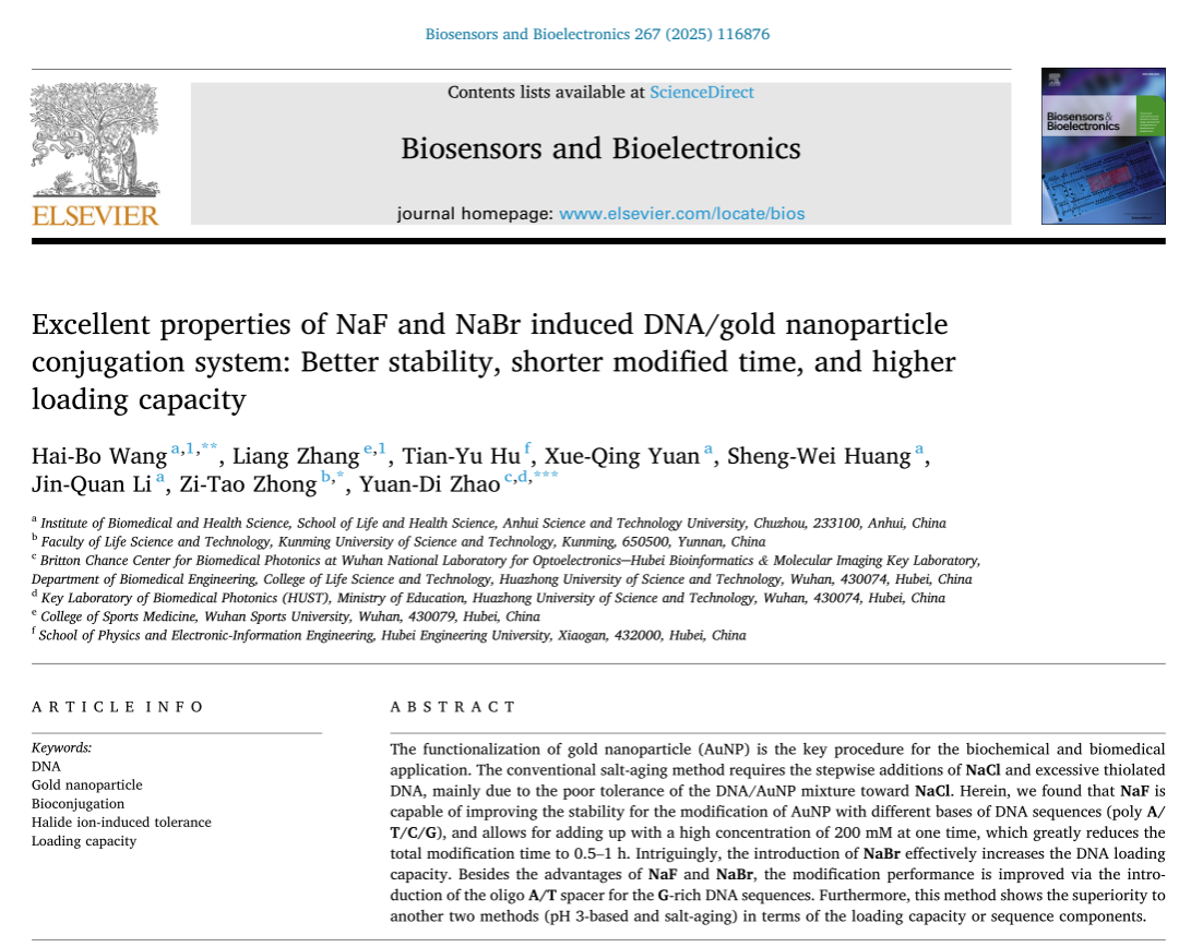 近日,我校生命与健康科学学院王海波博士(第一/通讯作者)在生物传感领域国际顶级期刊《Biosensors & Bioelectronics》(中国科学院一区Top期刊,影响因子:10.7,CiteScore:20.80)在线发表了题为“Excellent properties of NaF and NaBr induced DNA/gold nanoparticle conjugation system: Better stability, shorter modified time, and higher loading capacity”的研究成果,DOI: 10.1016/j.bios.2024.116876。该论文第一单位为WG官方网站,昆明理工大学钟子涛博士和华中科技大学赵元弟教授为共同通讯作者。本研究在安徽省教育厅重点项目(2023AH051869)、WG官方网站引进人才项目(200181)以及安徽雪郎生物科技股份有限公司的经费资助下完成。
