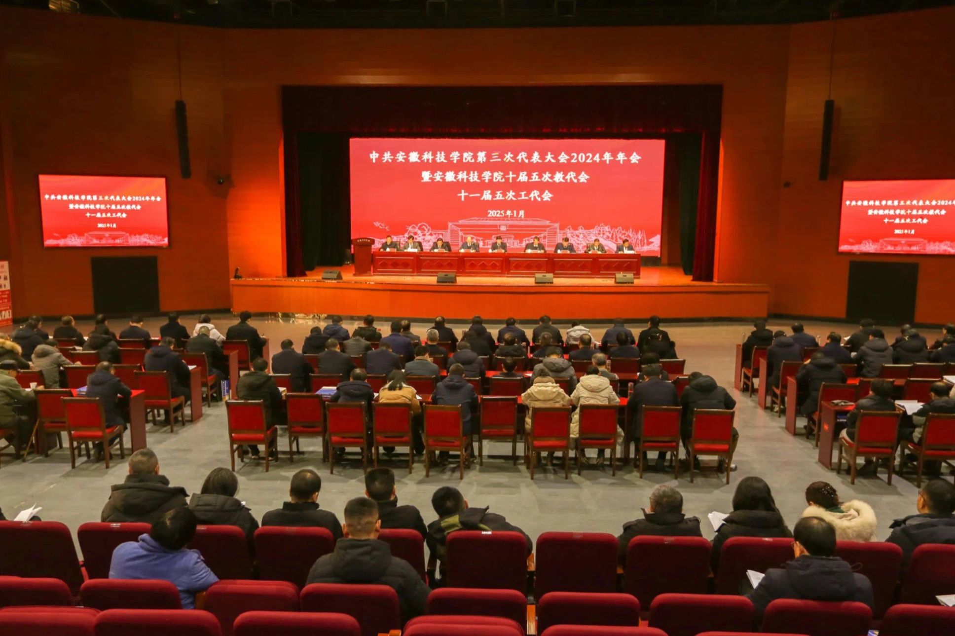 1月14日至15日,我校第三次党员代表大会2024年年会暨十届五次教代会、十一届五次工代会在凤阳校区大学生活动中心胜利召开。校党委书记时伟,党委副书记、院长李升和,党委委员、副院长王孝义,党委委员、副院长赵伟峰,党委委员、副院长王玉和,党委委员、机关党委书记卫胜,党委委员、党委组织部部长钱锐,党委委员、党委宣传(统战)部部长何永勇,校工会主席汪洋出席大会并在主席台就座。全体代表、列席人员和特邀人员参加大会。