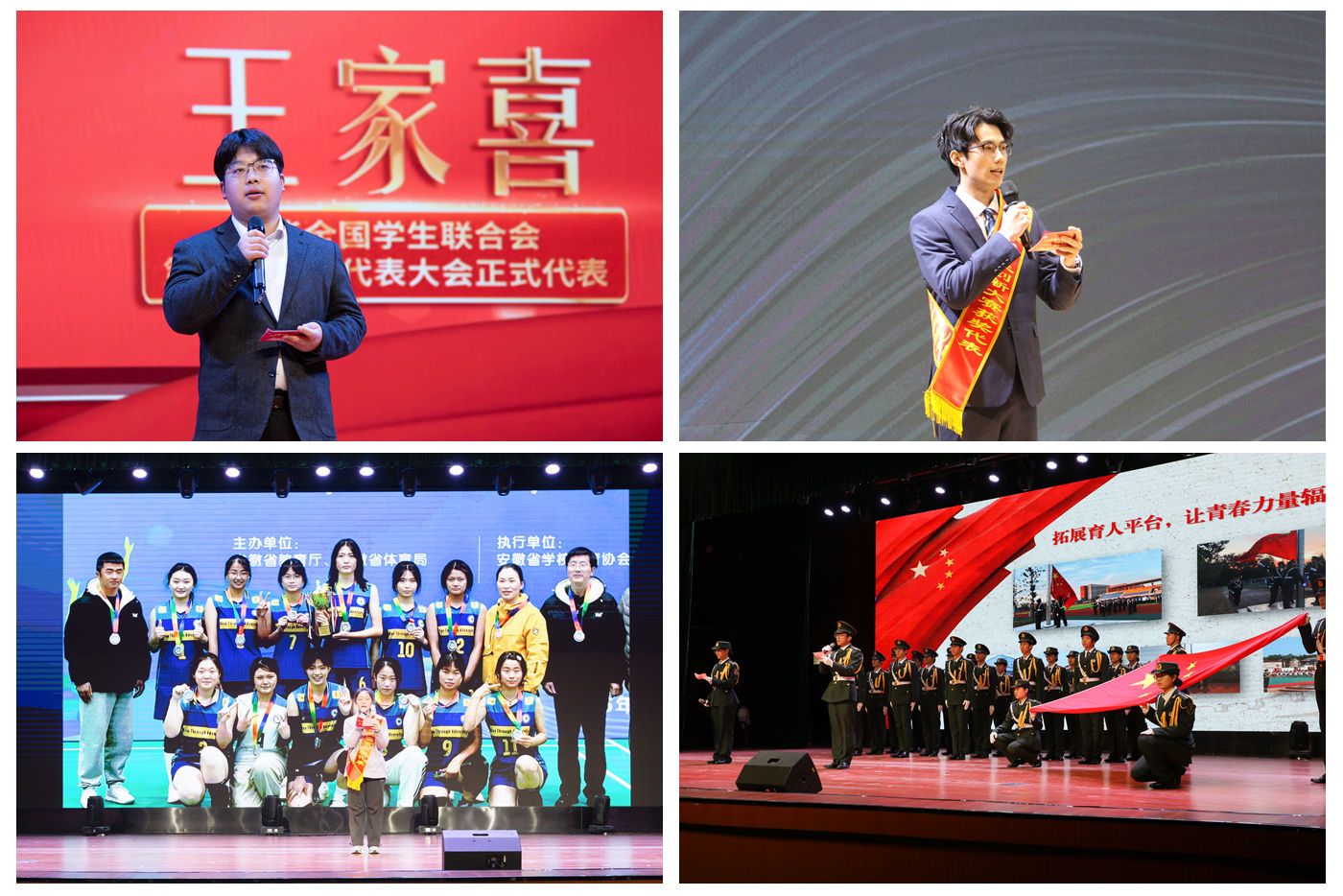学校学生年度表彰大会已连续举办4年,大会既是安科学子年度盛典,也是一堂发挥青春榜样示范引领作用活泼生动的青春思政课。会上,我校全国学联28大代表、人文学院王家喜,大学生创新大赛国赛银奖和“挑战杯”国赛银奖团队成员、化学与材料工程学院王洋旭,安徽省学生体育联赛大学生排球亚军、校女子排球队,安徽省活力社团“国旗护卫队”、西部计划志愿者常啸分别以“奋进”“创新”“拼搏”“青春”“担当”为主题进行了事迹分享。颁奖典礼中,安徽省大学生活力社团“大学生花鼓艺术团”现场展演了《火火的花鼓敲起来》、“安徽省大学生校园十大歌手”决赛晋级选手凌天羽个人独唱《勋章》、校大学生器乐协会献上精彩文艺节目。