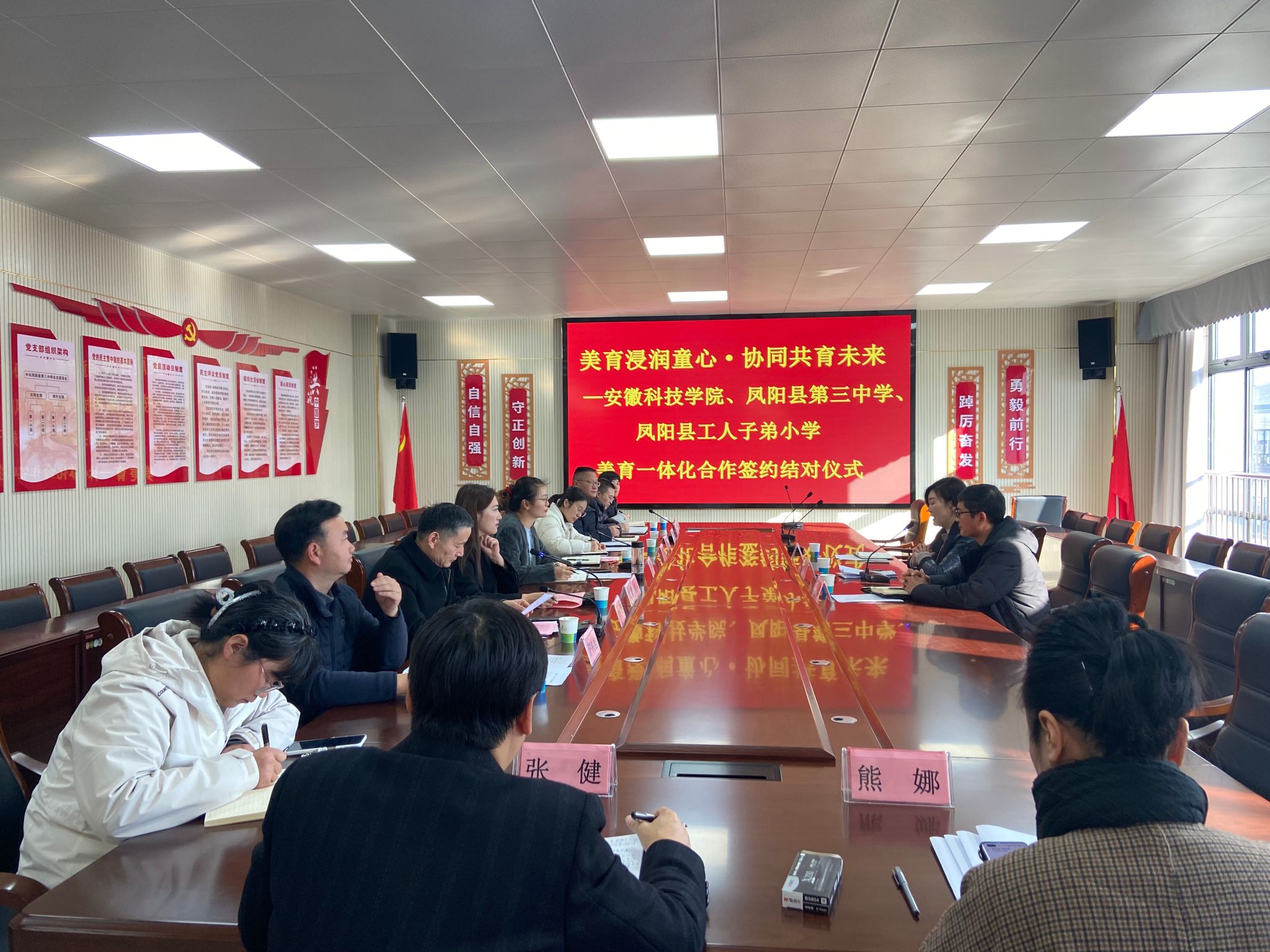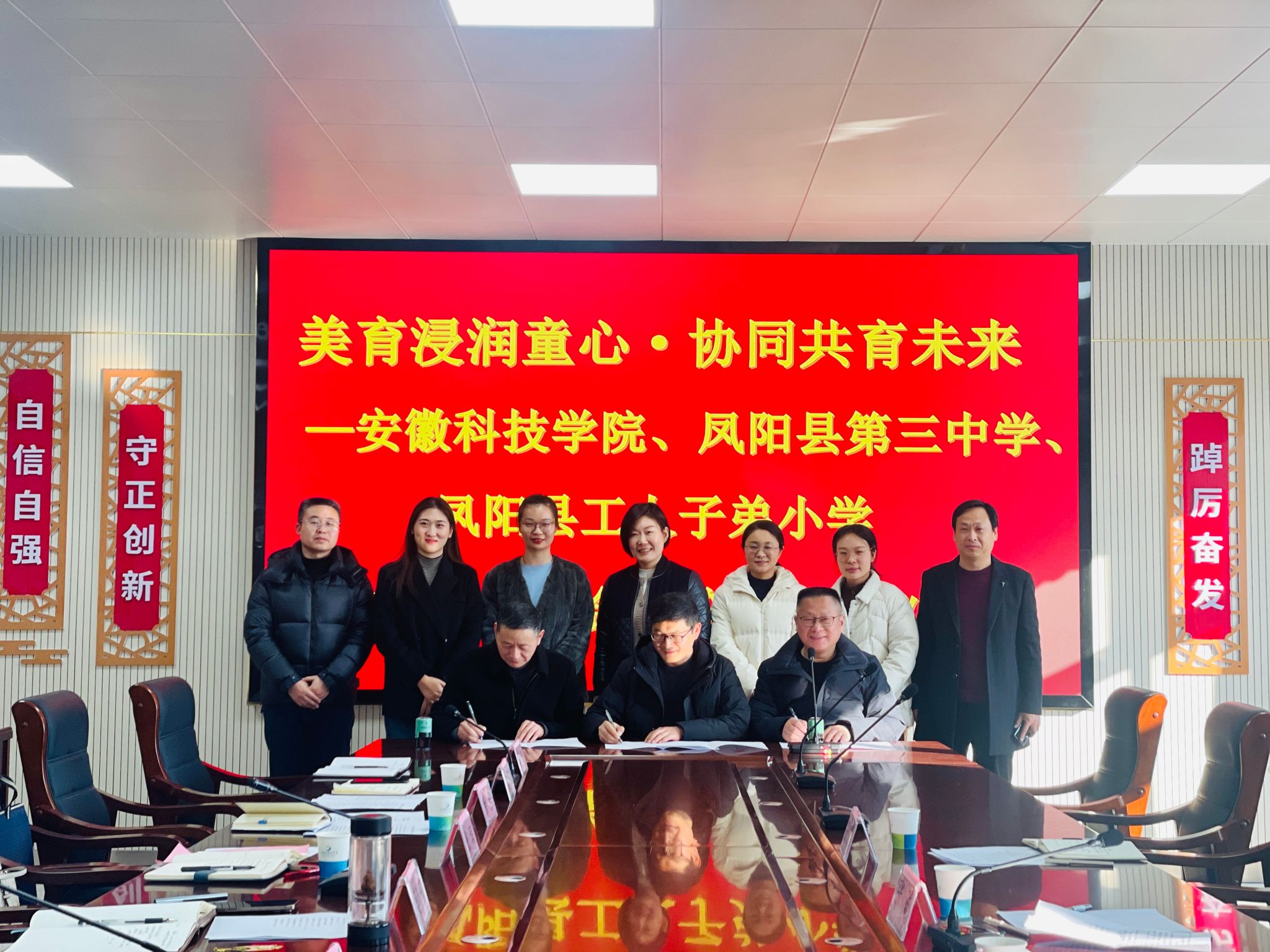 12月26日下午,凤阳县第三中学明道楼内暖意融融,“美育童心”大中小一体化行动签约结对仪式在此举行。校团委与凤阳县第三中学、凤阳县工人子弟小学正式签署结对协议,这标志着校地协同美育工作迈入常态化、长效化发展新阶段,为县域“美育共同体”建设注入了鲜活而持久的力量。
