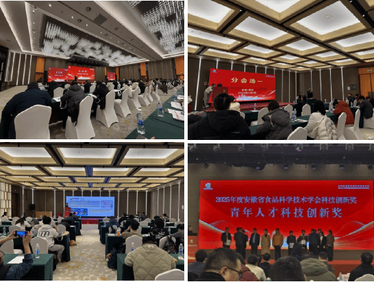 本次论坛设大会报告、分会场专题研讨及研究生论坛等环节。杜传来在分会场一主持专题汇报环节。期间,食品科学与工程学院青年教师黄明远、赵金龙分别作学术报告。黄明远作了题为“电荷驱动肌肉蛋白-多糖复合物的形成机制及其功能特性研究”的学术报告,展示了我校在食品蛋白质功能化领域的最新进展,赵金龙围绕“小麦多组分过敏原的交叉致敏机制与免疫检测研究”分享了其团队在食品安全检测方向的研究成果。报告内容扎实、视角前沿,展现了我校教师扎实的科研能力和学科特色,受到了与会专家的关注与好评。会上还举行了2025年度安徽省食品科学技术学会科技创新奖颁奖仪式,食品科学与工程学院青年教师杨丽萍、孟静南获青年人才科技创新奖。