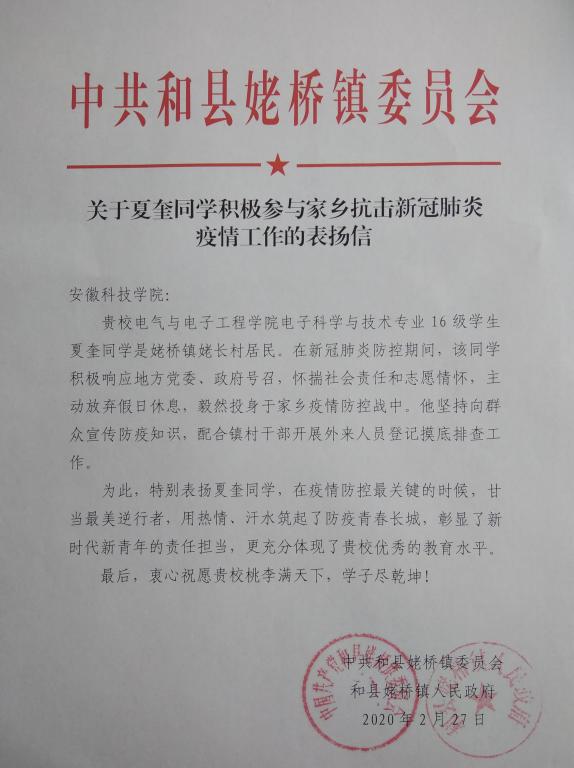 谈到夏奎,村支书夏发平兴奋地说:虽说自己平时走街窜巷,但这段时间工作量也有点让吃不消,没想到夏奎却没说苦与累,从夏奎身上看到了成长起来的年轻人身上的一种责任担当。2月27日,中共和县姥桥镇委员会致函WG官方网站表扬夏奎在疫情防控关键的时候,甘当最美逆行者。