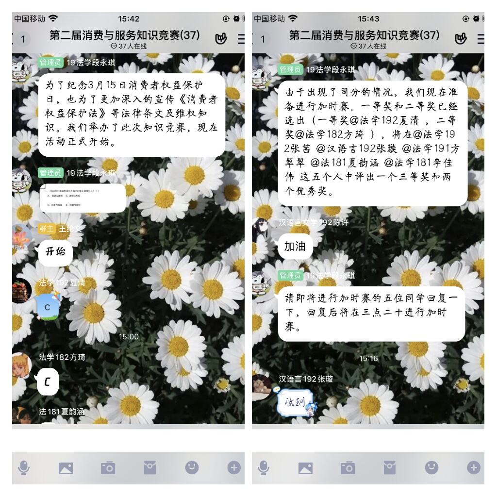 为深入宣传《中华人民共和国消费者权益保护法》及维权知识,增强大学生维权意识,又考虑到新型冠状肺炎疫情等实际因素,人文学院于3月15日下午,在“3.15国际消费者权益日”之际,利用QQ群在线上举办了一场3.15“消费与服务”网上知识竞赛。比赛由学院学生会权益维护部王纶文主持。
