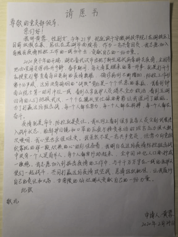 感谢信称,在全面阻击新冠肺炎疫情蔓延的特殊时期,黄蓉同学自愿加入志愿者的队伍。寒假在家期间,她听到社区在招募抗击新冠肺炎的志愿者,主动写了请愿书递交到社区,并要求社区安排她到最艰苦的岗位上去锻炼。在开展抗击疫情志愿服务活动的过程中,黄蓉同学不怕苦,不怕累,事事冲在前,展现了当代大学生应有的责任与担当。为此南陵县籍山镇逸和社区党支部特向所在学校发来感谢信,感谢学校的精心培养,感谢优秀的黄蓉同学。