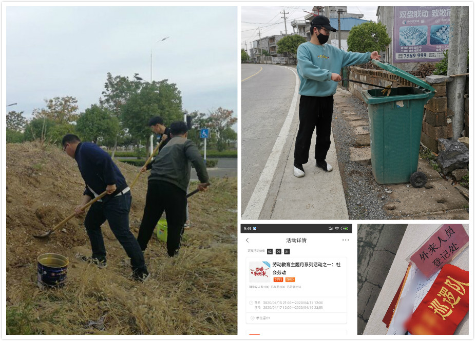 此次活动旨引导学生主动、积极地参与志愿劳动服务,用劳动帮助更多的人。学院学生纷纷行动起来,有的参与社区环保工作、有的参与疫情防控工作、有的参与田耕劳动......电信192孙彭斌,在安庆市宿松县许岭镇凿山村村委会的号召下加入保护环境志愿者队伍行列,进入林间小路,以及山间田地,进行清扫垃圾的行动。孙彭斌讲道:希望自己的行动能够深深地影响着家乡的每一个人,提高了大家保护环境的意识。电气191徐玉柱,在合肥市长丰县朱巷镇造甲乡村主任的带领下,开垦荒地,为老年人种菜。他说:通过这次劳动,体验到了“自己动手、丰衣足食”。电气192毕玉龙投身合肥市长丰县造甲乡凤群小区的疫情防控工作中,对外来人员登记、在小区巡逻,根据车牌查找外来车辆,并询问车主情况。