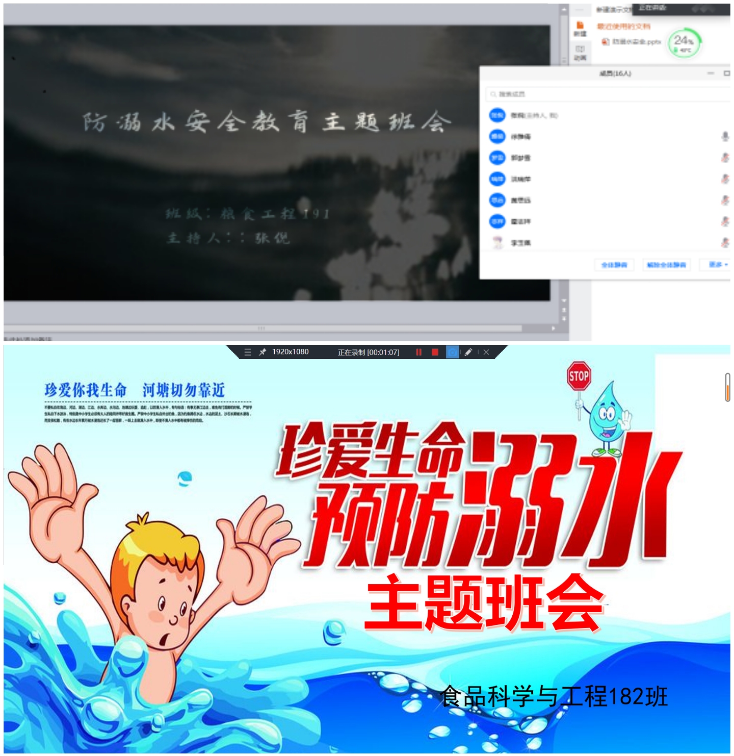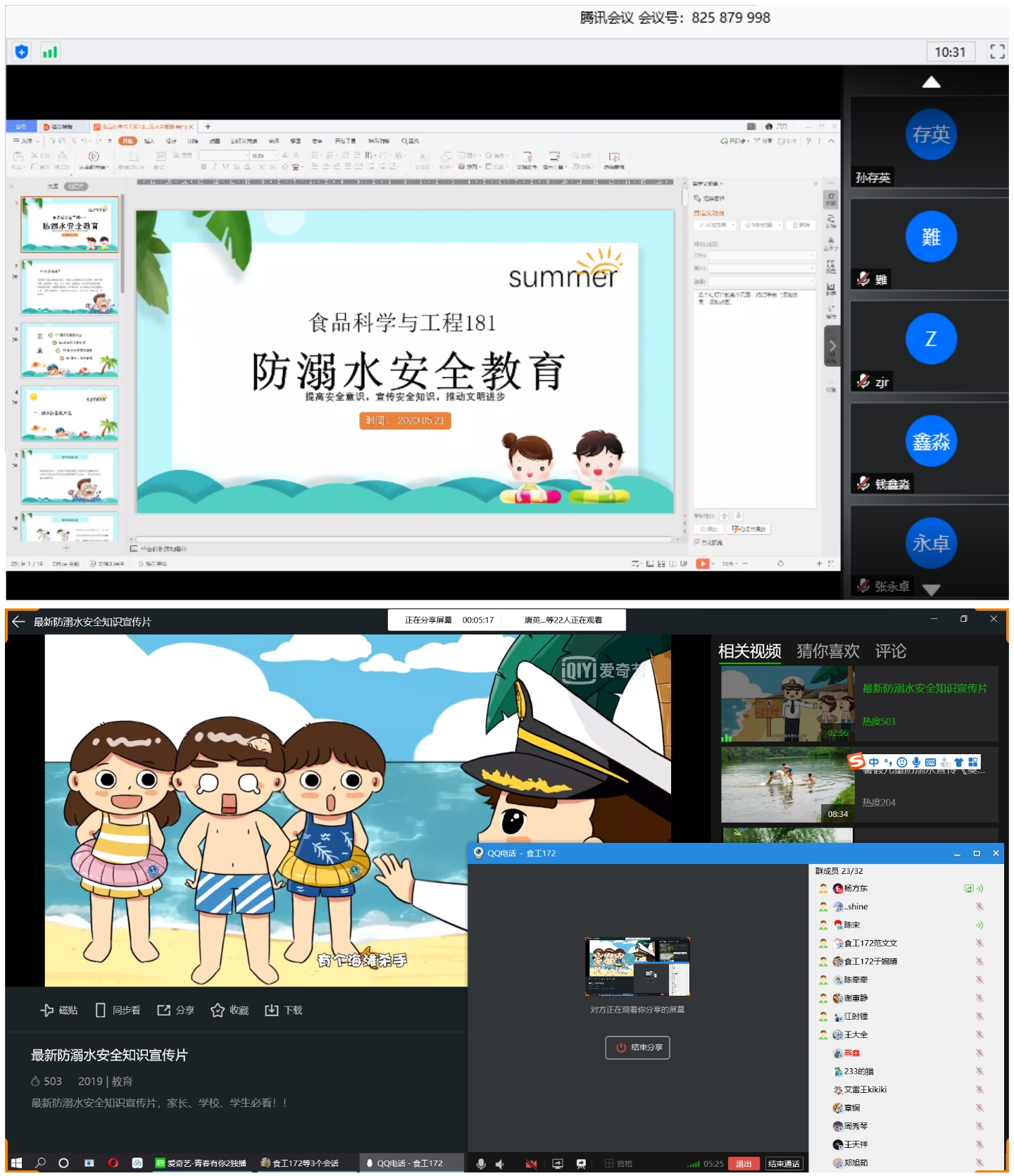 食品工程学院各班级积极响应学院号召,利用QQ、腾讯会议等线上平台,多形式、多方面、多角度的召开班级防溺水主题安全教育班会。食品科学与工程181班利用腾讯会议围绕溺水是如何造成的、如何预防溺水、溺水时如何他救、溺水时如何自救四个方面向班级学生汇报防溺水主题教育PPT。食品科学与工程172班则通过播放防溺水宣传片向班级学生展开安全教育。各班级还通过签署防溺水承诺书,溺水案例分析等方式开展班会。强有力的向学院学子介绍了夏季溺水的危害,大大地提高了班级学生防水安全意识,促进了校园安全教育的开展。