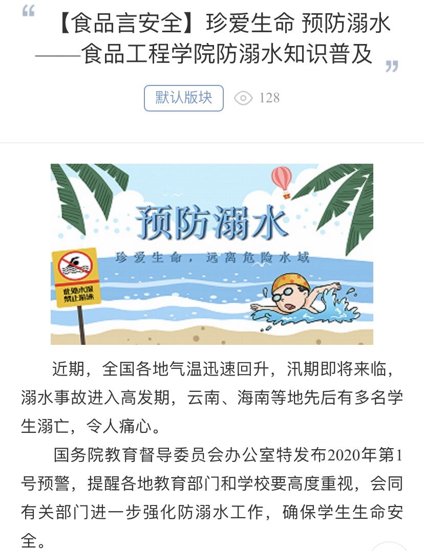 食品工程学院学生会网宣部、易班工作站,分别以微信公众号、易班为主阵地,围绕预防溺水、溺水科普、溺水救助等方面进行了一系列宣传,发布了“珍爱生命,预防溺水——食品工程学院防溺水知识普及”等话题。