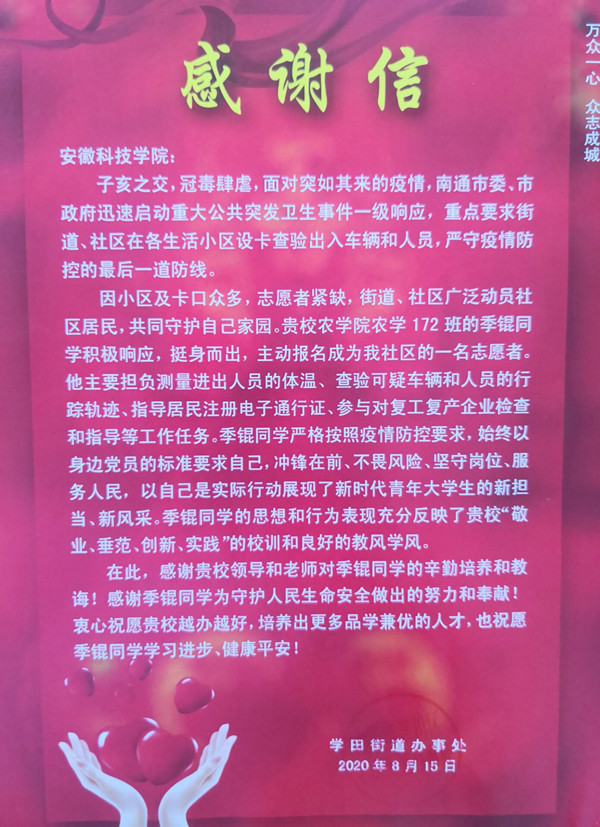 一站就是7个小时的季锟,在被问到当志愿者的感受时,他说,“每天站下来,双脚既麻又困,长时间带口罩,里面都湿了,痒痒的时候,还不能用手动,拿着体温枪的手也累得发酸,下雨下雪也要在岗位坚守。不过虽然辛苦,但是作为一名大学生,能够为疫情防控尽一份力,我觉得很开心,也深刻感受到了在党的领导下社区人民的积极响应,众志成城抗疫情”。为了表达对我校大学生的肯定,学田街道特地向学校发来感谢信。