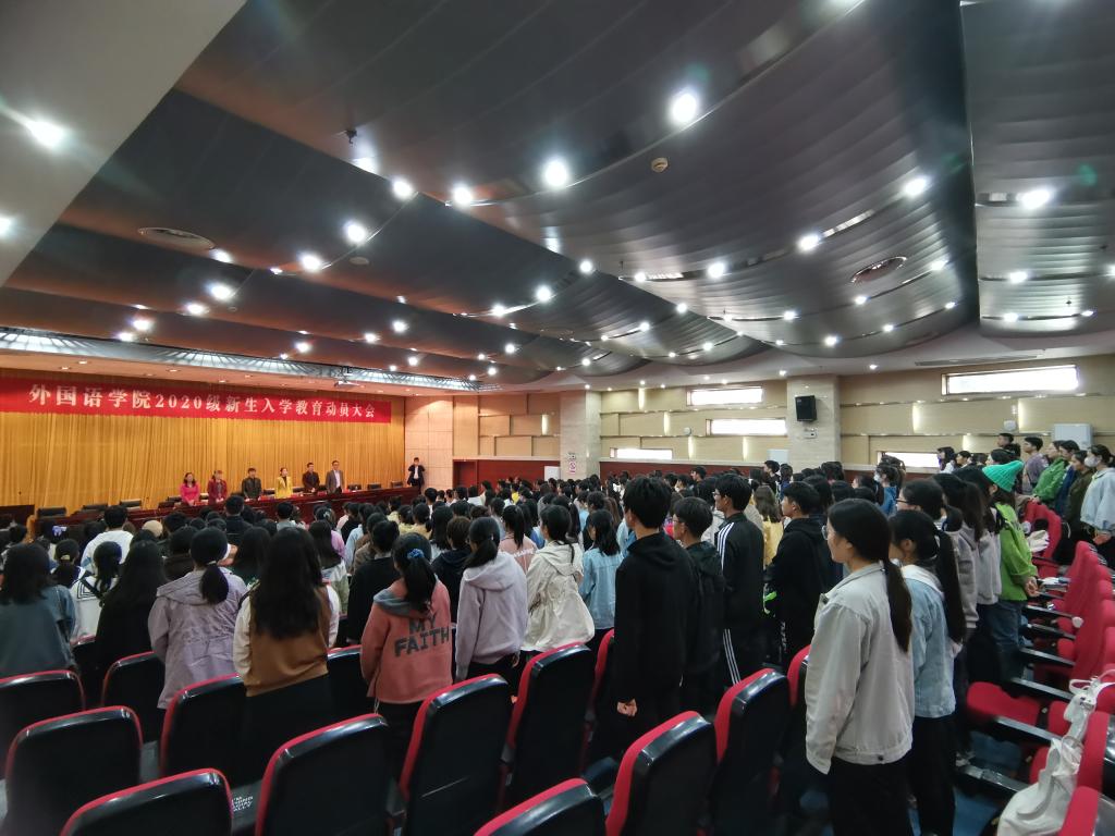 丹桂飘香,金秋送爽。20级新生带着青春的活力,带着对知识的不懈追求,带着对大学校园生活的无限憧憬,迈进了WG官方网站外国语学院。为了让新生更快适应新环境,适应新的生活,顺利、平稳、有效地进入大学生活。10月21日下午14:00,外国语学院在新图书馆第二报告厅举行了新生入学教育动员大会。外国语学院院长陈德用、党总支书记蔡为青、副院长刘萍、教学秘书周海平、英语专业教研室主任兼英语专业负责人洪民老师、翻译专业教研室主任兼翻译专业负责人邓兆红老师、分团委书记陈慧中、专职辅导员宋兵兵,学院教师代表,全体20级新生参会,大会由刘萍主持。