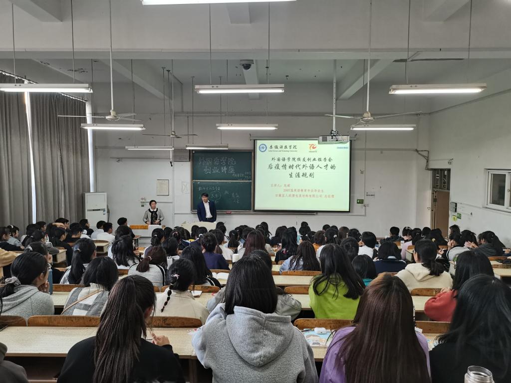 11月7日下午,外国语学院优秀校友创业报告会在求知楼A座205教室举行。本次会议邀请06届英语专业毕业生、上海轶歌实业有限公司董事长陈从彬,06届英语专业毕业生、诺亚财富绍兴分公司总经理梅杰,09届英语专业毕业生、安徽宜人纸塑包装材料有限公司总经理龙超,学院党总支秘书张海亮、分团委书记陈慧中出席, 20级全体新生参加本次讲座。