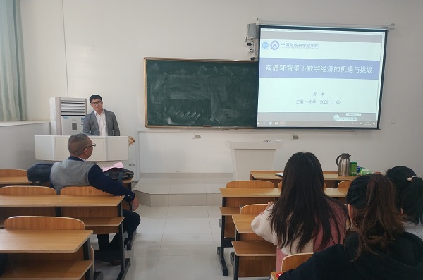 周孝作了题为《双循环背景下数字经济机遇与挑战》的学术报告。他首先介绍了数字经济的定义、数字经济的现状与特征,提出双循环既是必然也是偶然,接着对内循环和外循环作了比较分析,提出以内为主并不是封闭式循环,更不是搞“闭关锁国”,要坚持“走出去”和“引进来”相结合。最后详细阐述了内循环背景下数字经济的机遇和挑战。