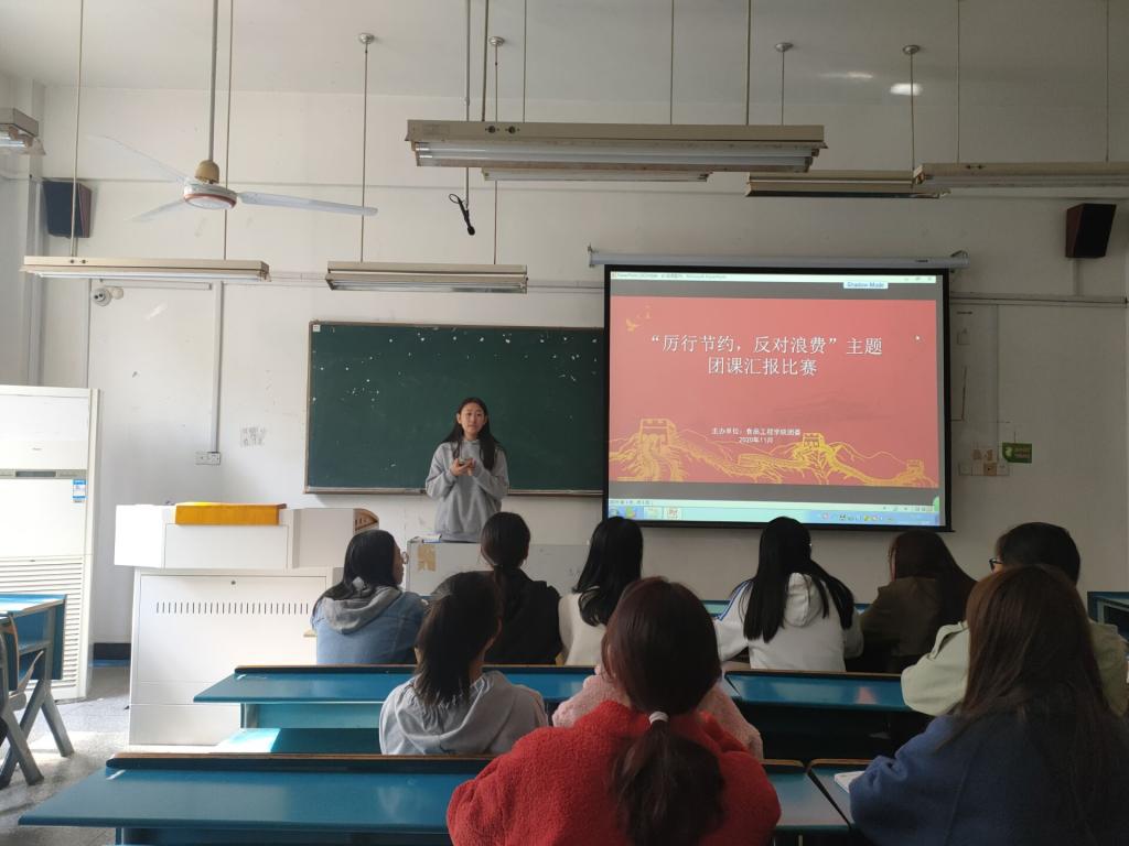 为进一步加强校园文明建设,弘扬勤俭节约的中华传统美德,坚决杜绝餐饮浪费行为,增强同学们的节约意识,并了解当今粮食短缺状况。食品工程学院面向非毕业班团支部开展了“厉行节约,反对浪费”系列主题团日活动,并于11月11日中午12点半在求之楼b104开展“厉行节约,反对浪费”系列主题团日活动汇报比赛。食品工程学院团委兼职副书记刘文卓、食品工程学院团委委员王珍珍、食品工程学院院团委委员郑晨蕾、食品工程学院二届二任心理委员联合会负责人马文新、食品工程学院二届二任茶艺社社长李亚宁出任本次比赛评委。