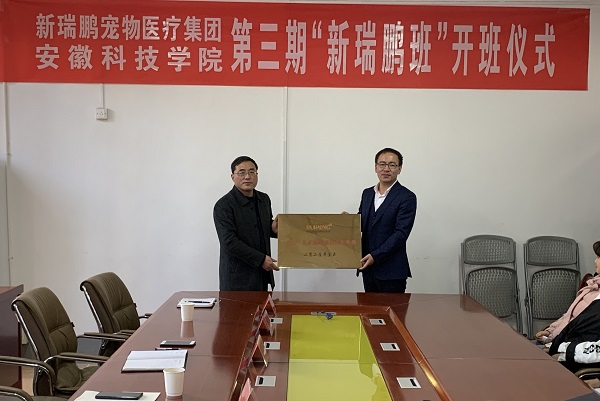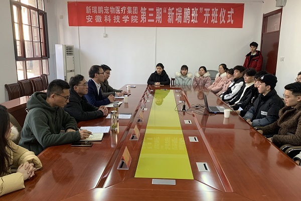 1月12日下午,由动物科学学院携手新瑞鹏宠物医疗集团校企合作共建第三期“新瑞鹏班”开班仪式在学院会议室举行。新瑞鹏集团苏皖区总经理胡旺庭,动物科学学院党委书记姚勇,新瑞鹏集团苏皖区招聘副经理付蓉、招聘专员何丰,动物科学学院副院长贺绍君,团委书记、“新瑞鹏班”班主任李焱出席开班仪式。第三期“新瑞鹏班”全体学员以及部分学生代表参加开班仪式。仪式由学院党委副书记汤帅主持。