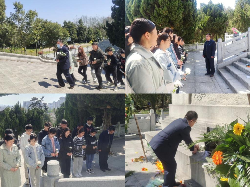 活动伊始,何世潮在纪念碑前结合清明祭奠传统、革命先烈贡献和党史学习教育向与会人员上了一堂课外微党课,要求各学生组织发挥职能带领全体同学弘扬传统文化,铭记革命先烈,学习感悟党史,锻炼增长才干,争做德智体美劳全面发展的人才。何世潮为革命先烈献上花束。随后全体成员在庄严肃穆的纪念碑前整齐列队,肃立在烈士墓前低头默哀三分钟,深切缅怀革命先烈的英雄事迹。接着何世潮、郑玉莲带领全体同学,依次向先烈献花、鞠躬,并围绕烈士碑绕行一圈,表达对先烈的哀思与敬仰,铭记英烈的历史功勋,维护英烈的尊严荣誉。