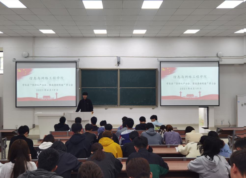 为深入推进学生会组织改革,进一步改进我院团学干部的工作作风,提高服务学生的水平和质量,4月19日下午,信息与网络工程学院于致知楼B111召开“坚持从严治会、塑造清新形象”专题学习会,学生会全体成员参加会议,会议由学生联络部部长田辰坤主持。