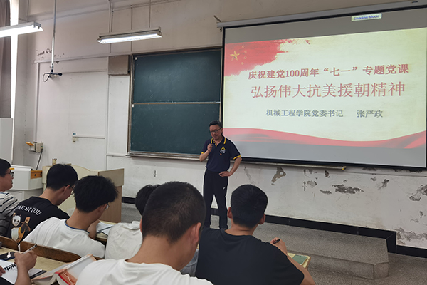 2021年6月9日下午,机械工程学院机电与机器人专业学生党支部在求知楼A201,举办庆祝建党100周年“七一”专题党课。专题党课由学院党委书记张严政主讲,副处级辅导员、党支部书记开金苗主持,机电与机器人专业学生党支部64名党员参加。