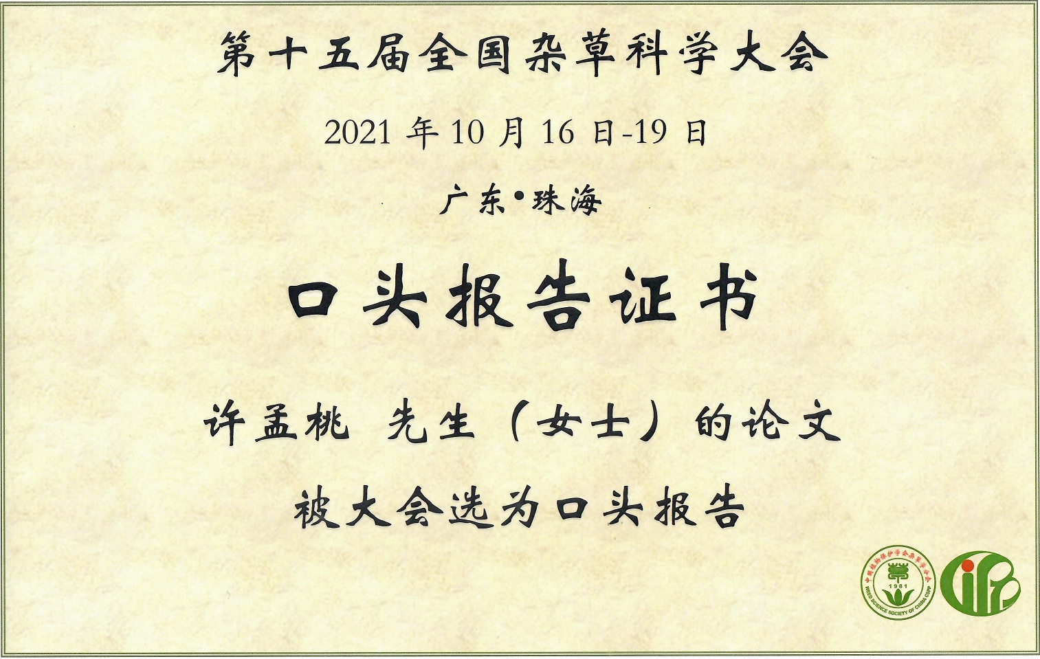 我校农学院植物保护系主任毕亚玲博士带领其团队三名研究生参加了会议。我校2020级农艺与种业领域研究生许孟桃在研究生专场做了《砜吡草唑除草活性及应用技术初步研究》的研究生专场报告,并对现场专家提出的问题进行了对应式回答,其提交的会议论文获得了优秀论文奖。许孟桃的现场报告和理论功底表现突出,受到与会专家的好评。同时,毕亚玲提交的杂草摄影作品《苋之现》荣获优秀摄影作品奖。