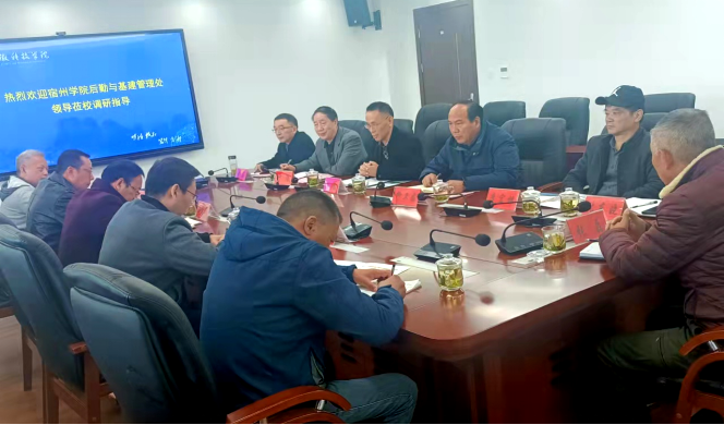 11月11日,宿州学院后勤与基建管理处副处长孙继军、后勤与基建管理处副处长周霁野、后勤与基建管理处饮食服务监管中心主任马庆功、后勤与基建管理处医疗保健服务保障中心主任曹少飞、后勤与基建管理处水电管理与节能中心科员卢友福等一行7人来我校考察交流,后勤保障部副主任谷凯、副主任柳卫国、校医院院长曹军、饮食服务监管中心主任叶浩、公寓管理服务中心主任张东晓、水电管理与节能中心主任李宏根、后勤保障部物业服务监管中心主任张磊等热情接待来访宾客,交流会议由谷凯主持。
