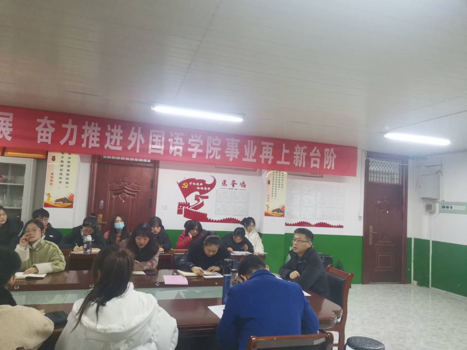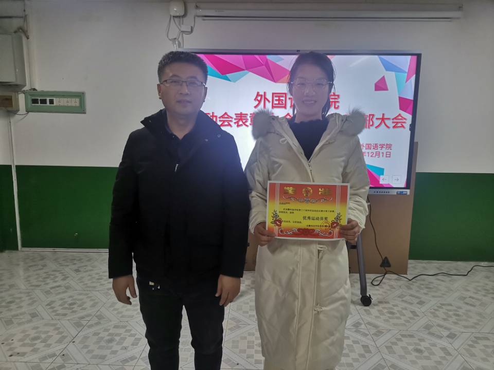 在干部大会上,陈慧中、宋兵兵、张薇薇分别布置了各自分管的工作,如:奖学金使用管理、安科E创项目申报、安全稳定、疫情防控、学风建设、意识形态、外语文化节闭幕式晚会、学籍异动等内容。在表彰会议上,与会老师们为获奖运动员颁发奖状并合影留念。宋兵兵宣读了《外国语学院学生在WG官方网站第30届运动会的通报表扬名单》,张薇薇宣读《外国语学院在校第30届运动会中获奖运动员名单》,院学生会执行主席桂纪昌对本次校运动会进行了总结发言。