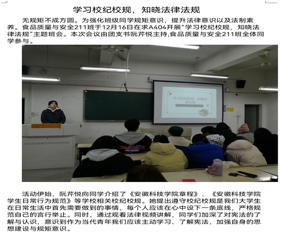 为进一步加强法治宣传教育,贯彻落实学校要求,各班级组织学生登录普法网,认真学习宪法知识,深入学习习近平新时代中国特色社会主义思想,进一步增强法治意识,坚持爱党爱国爱社会主义高度统一。同时,按照要求,各班级组织开展了学校规校纪和学法律知识主题班会,班级主要学生干部在班会上进一步宣讲《WG官方网站章程》《WG官方网站学生日常行为规范》《WG官方网站学生违纪处分办法》《普通高等学校学生管理规定》等校规校纪和法律知识,教育引导同学们掌握法律知识,做一名遵纪守法的好学生。