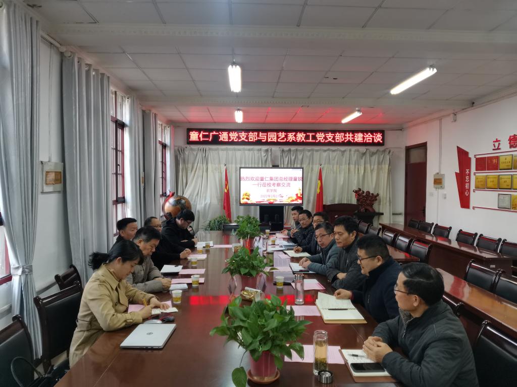 何世潮对公司一行人的到来表示热烈欢迎,介绍了学校历史沿革及近几年取得的新成绩,介绍了农学院的人才培养、科学研究、社会服务等情况。童锐介绍了童仁集团概况,何云斐介绍了党支部党建工作及取得的成绩,表达了与园艺系教工党支部共建的愿望。隋益虎介绍了园艺系教工党支部“党建促发展”、开展“乡村振兴”活动情况,表示期待以项目申报和人才培训等为切入点与公司合作。宾主双方围绕智慧农业、数字农业、乡村振兴等进行了研讨交流。