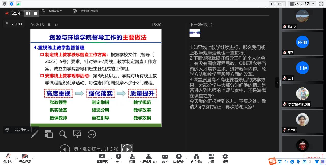 会上,校督导员杨剑婷老师分享《应用型高校评价改革与内部质量保障体系建设专题培训会》的学习成果,资环学院督导组组长邹海明分享学院督导工作创新措施,给其他二级学院督导工作提供了非常重要的参考价值和借鉴意义。本次督导工作会议的召开,明确了下一步重点工作及其要求,对学校线上、线下教学督导工作具有重要的指导意义。(特约通讯员:马万征 摄影:卫兰兰 审核:程斌 编辑:张威)
