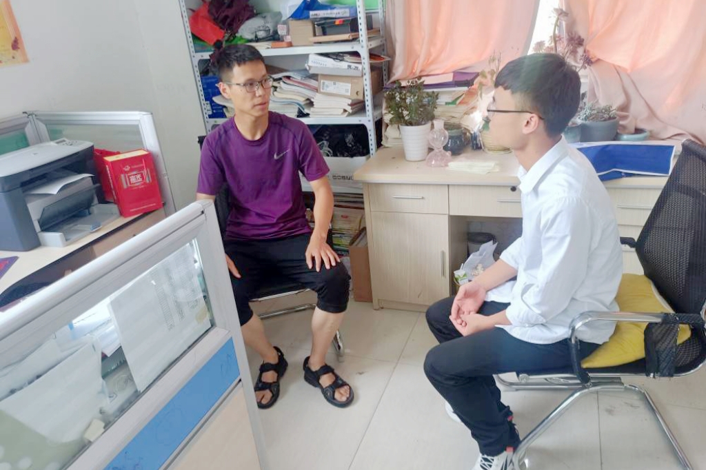 到达校园后,王健伟团队拜访了高三班主任崔猛老师和高中生物老师王乐潇。王健伟向老师说明了此次实践的主要目的和内容,介绍了WG官方网站的相关情况。在了解团队此行目的之后,崔老师、王老师非常热情地组织了部分高三返校生开展学习交流。